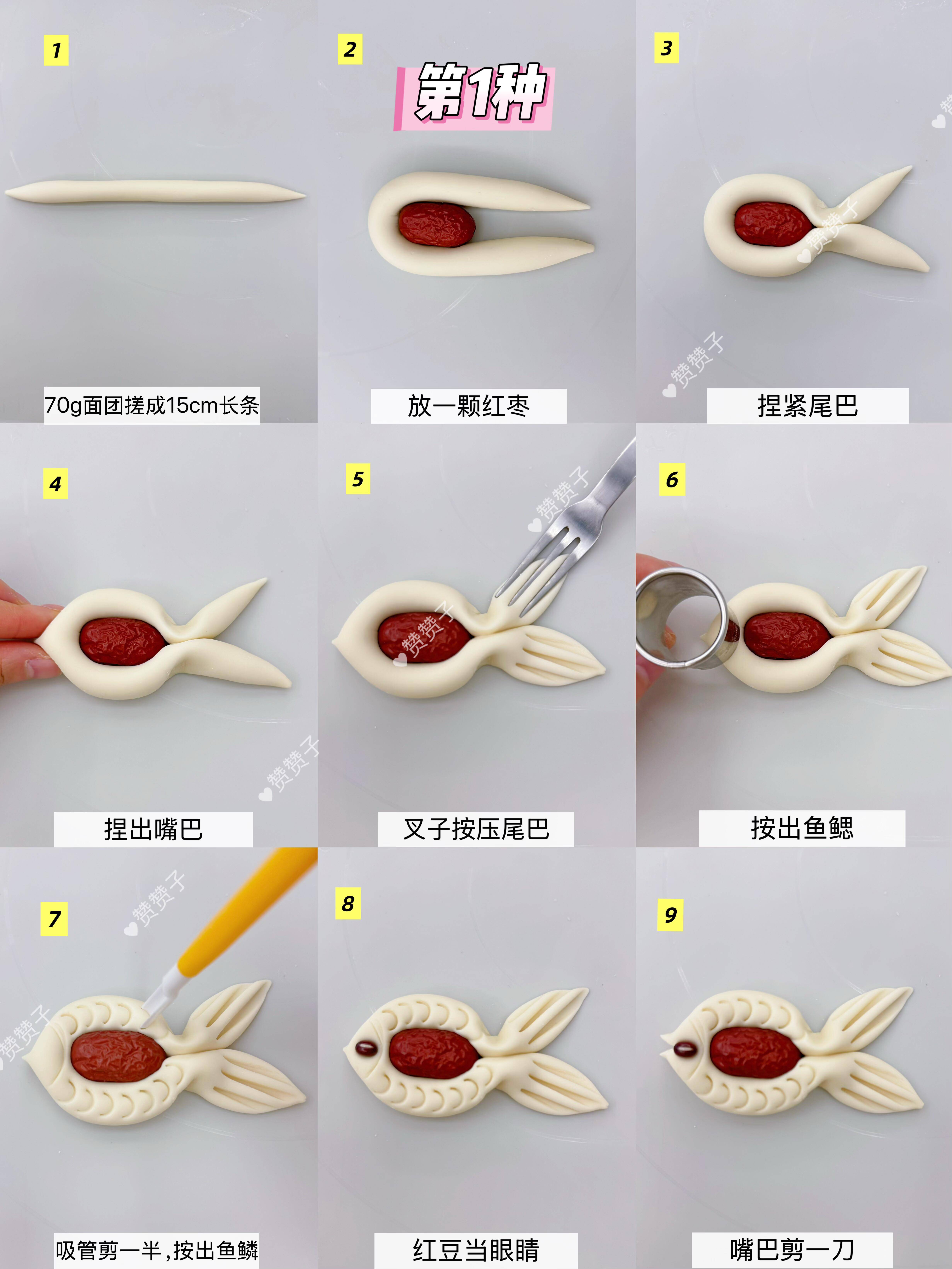 • 做法:面团搓成长条,中间放红枣,两端捏紧成“鱼身”;叉子压出鱼尾花纹,吸管按出鱼鳞,红豆当眼睛,剪刀剪个小嘴巴,一条活灵活现的小金鱼就好啦!懒人技巧:没有模具?用吸管、叉子、剪刀就能搞定花纹,孩子都能跟着捏~