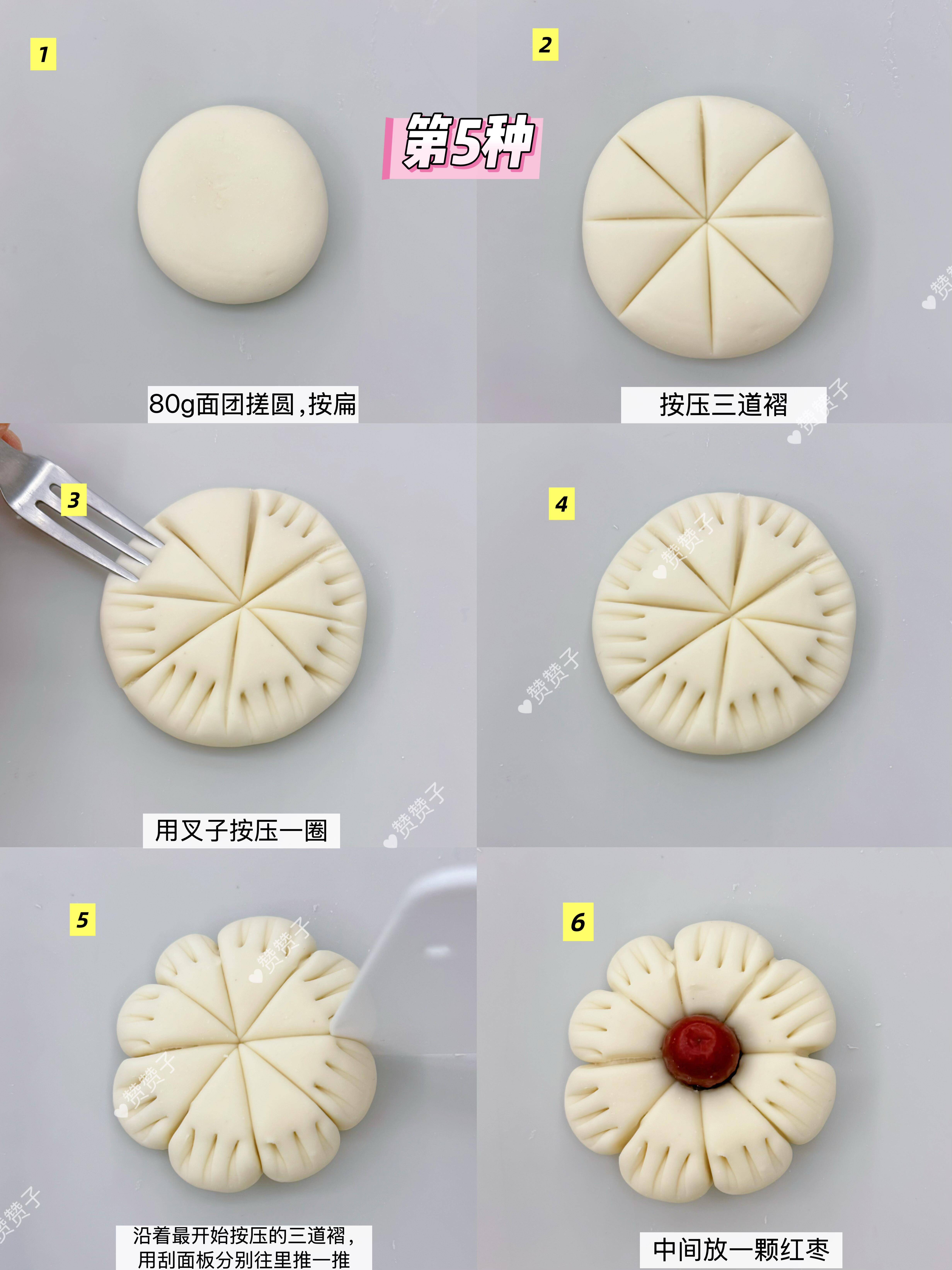 • 做法:面团按扁,压出三道褶,叉子绕圈按出花纹,沿褶子往里推成花瓣,中间放红枣,蒸出来像小太阳,孩子抢着拿。隐藏吃法:中间的红枣可以换成豆沙馅,甜香翻倍!