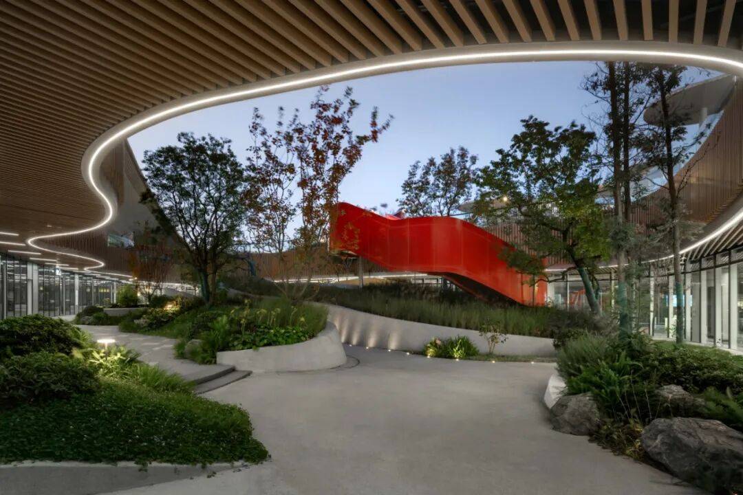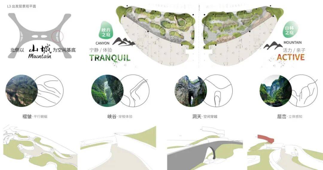 山城与江城的双重意象:设计从重庆“山在城中,城在山上”与“江在城中,城在江里”的地理特征出发,将L3出发层划分为北庭院(山意沉浸)与南庭院(江韵悠然),通过垂直线性空间模拟峡谷、溪谷等自然形态,形成“一步一景”的沉浸式体验。