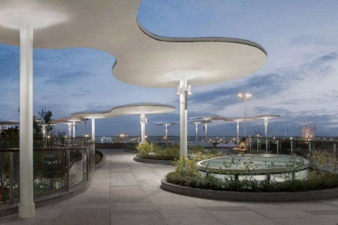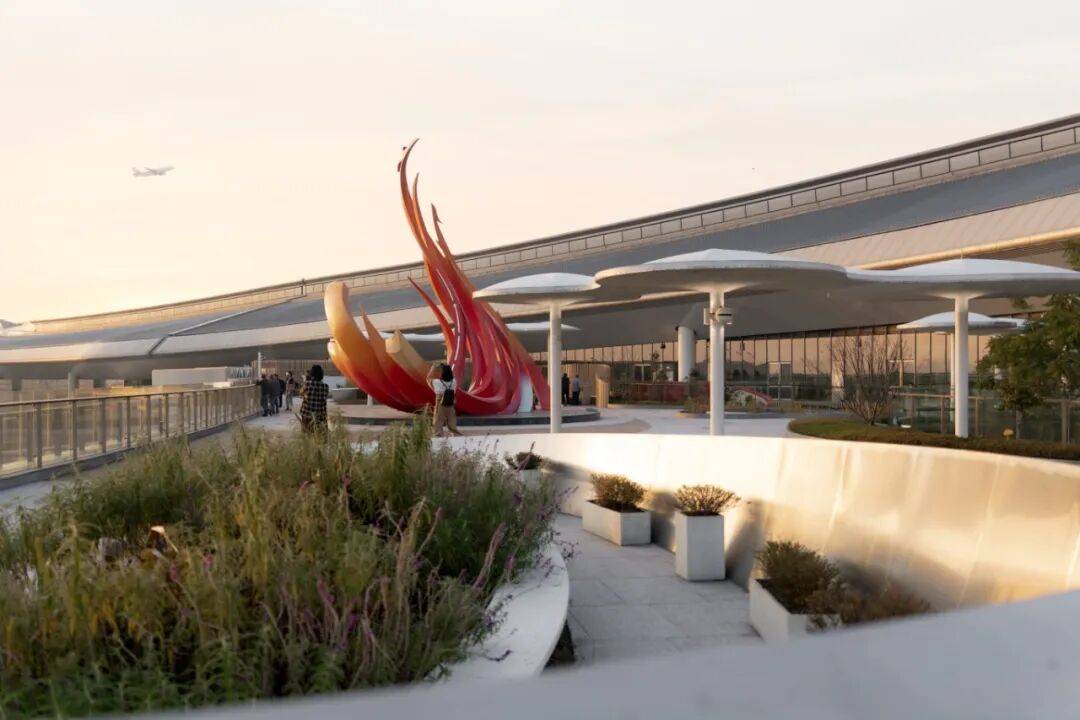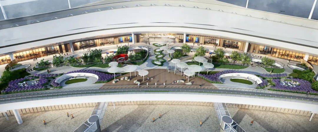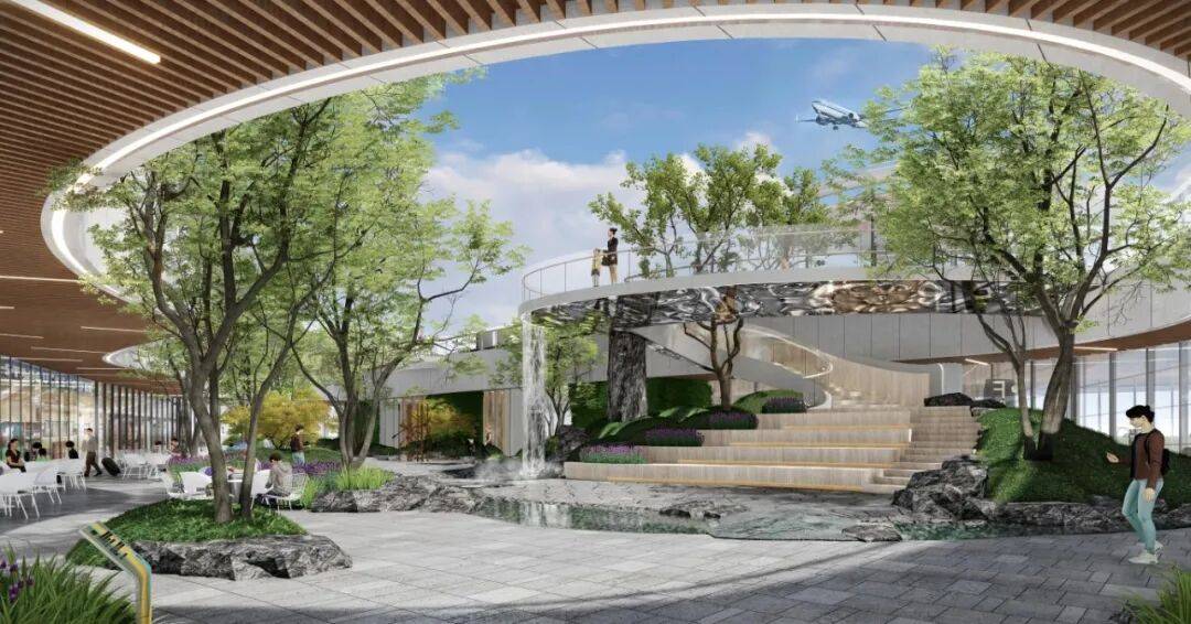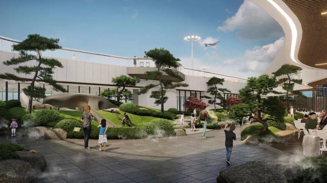 空中花园与观飞平台:绿意如云蔓延的空中花园,搭配轻盈漂浮的“流云”廊架,为旅客提供静观飞机起落的独特视角。