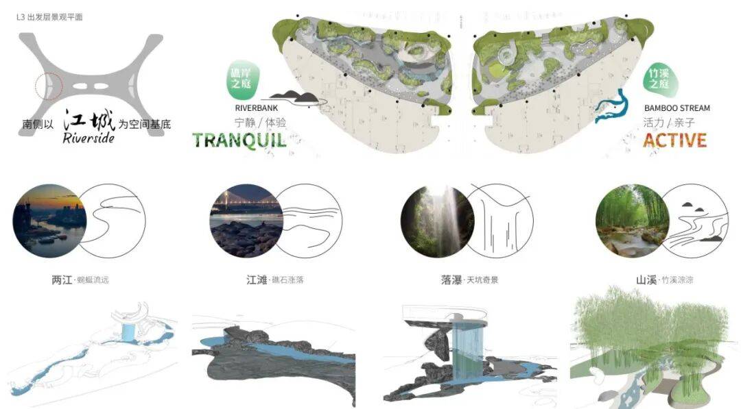 喀斯特地貌与两江交汇:以立体交通构建溪谷聚场,水流与光影交织,营造“江滩共长天一色”的静谧声景。