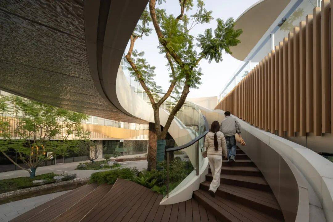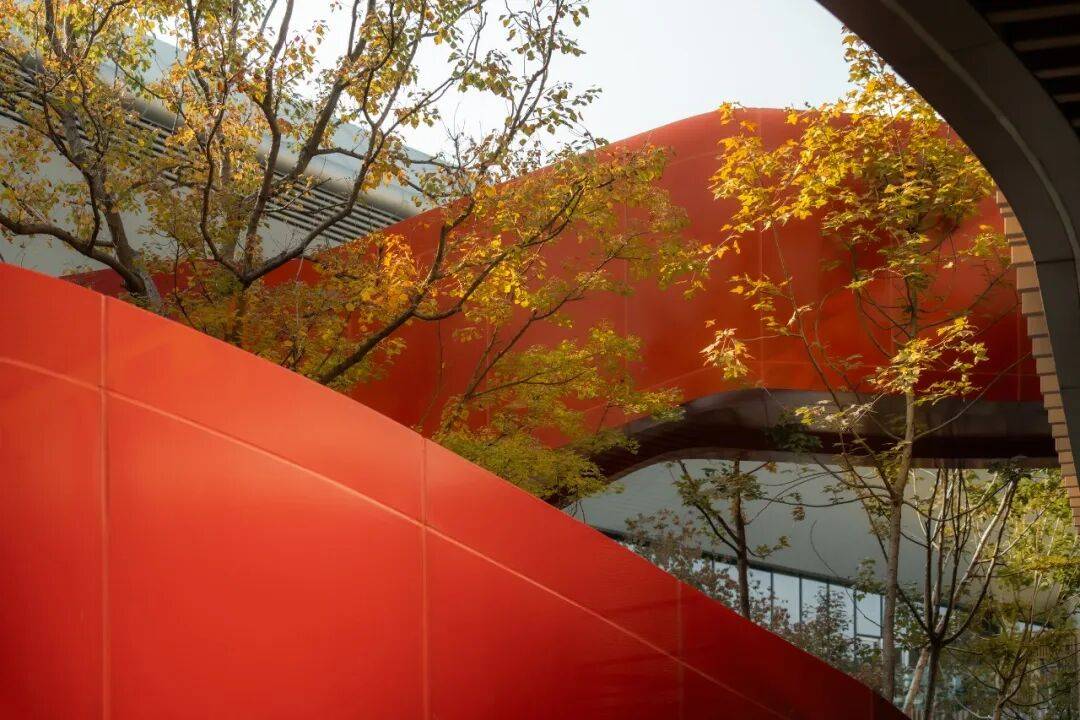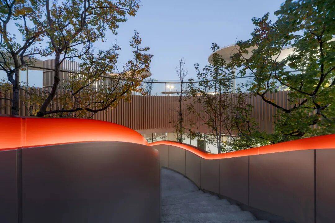 褶皱山形与溶洞幽谷:通过垂直线性空间模拟川东平行岭谷的褶皱地貌,红色阶梯如凤凰翎羽蜿蜒穿越树梢,形成动态的视觉引导。