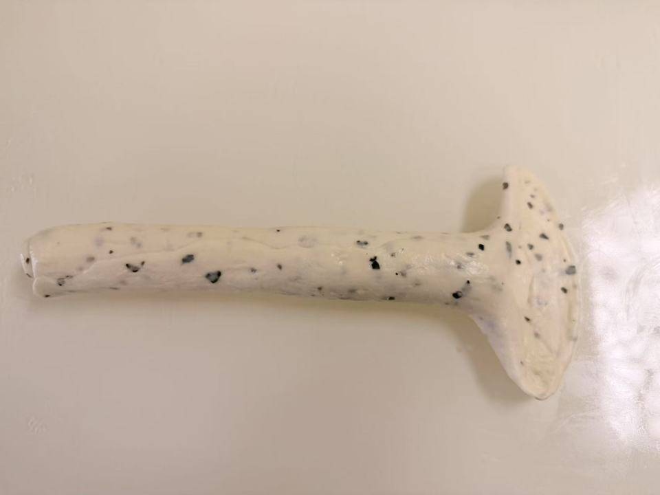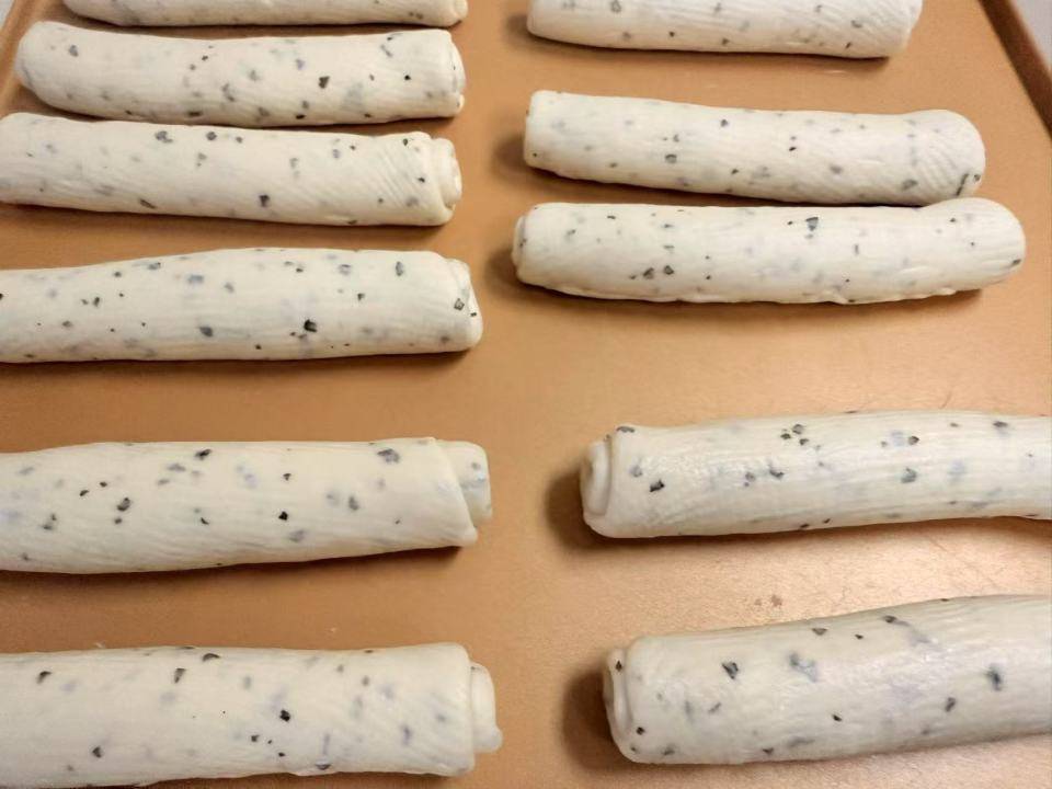 1. 揉面与整形:除黑芝麻外所有材料揉匀出厚膜后加黑芝麻,揉匀分成六份揉圆松弛 15 分钟。15 分钟后整形,擀成长方形翻面自上而下卷起长约 18 厘米,接缝朝上,一头擀开,另一头卷过来包住收口捏紧。