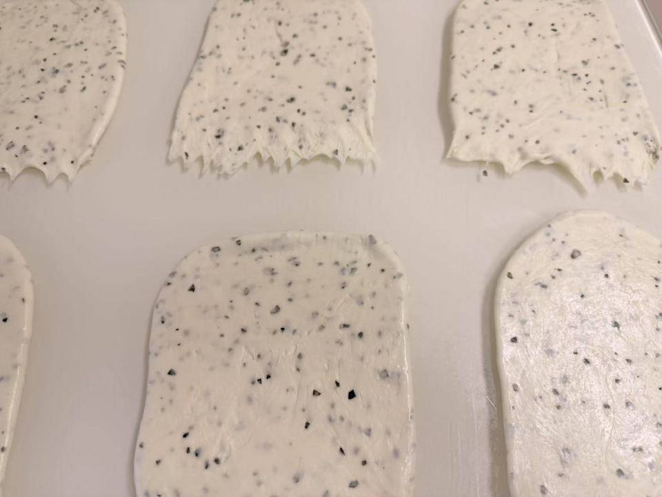 3. 烤制:捞出底部沾芝麻放在烤盘上晾干,然后放入烤盘上下火 190 度烤 16 分钟。