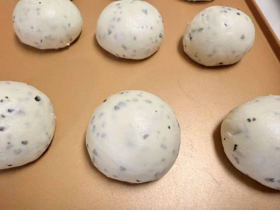 除黑芝麻外所有材料揉匀,出厚膜后加入黑芝麻,揉匀,分成六份揉圆,盖保鲜膜松弛15分钟。