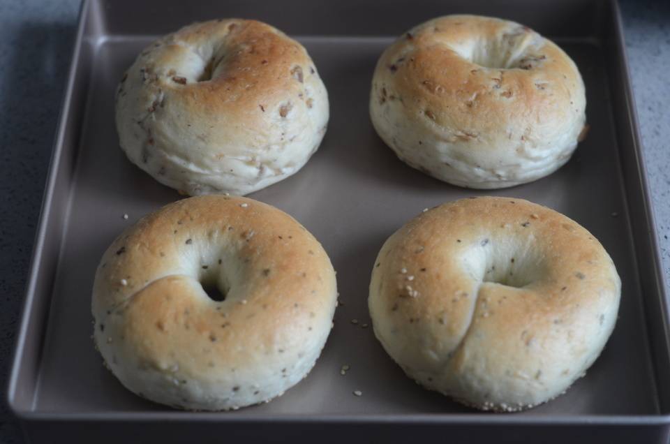 2. 发酵与煮水:放入烤箱 35 度发酵 30 分钟,发酵还剩 5 分钟时煮水,水开后放入贝果每面煮水不超过 30 秒。