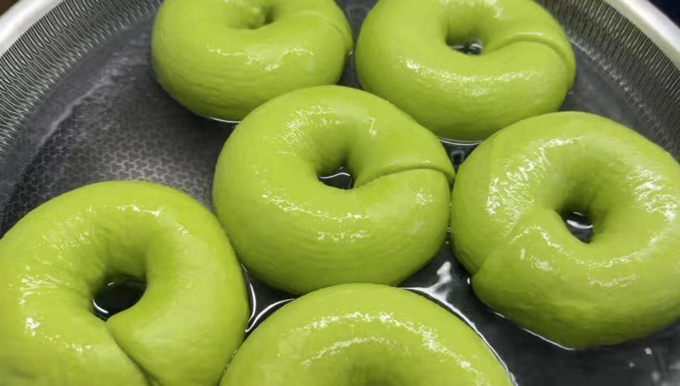 发酵还剩5分钟时就开始煮水,(发酵完成立刻预热烤箱,确保煮好糖水就能立刻烤制)。水开后放入贝果,每面煮水不要超过30秒,这一步忘记拍照了,用了抹茶贝果的图片。