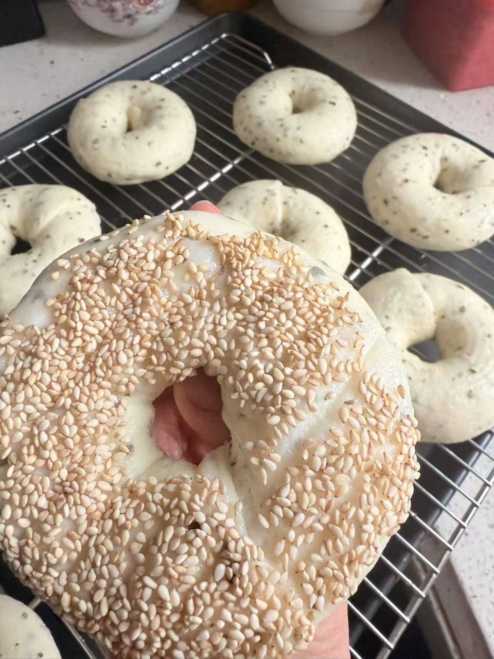 贝果食材:高粉 300 克、水 165 克、糖 10 克、盐 2 克、酵母 3 克、黑芝麻 30 克,(煮水用)糖 25 克、水 1000 克。