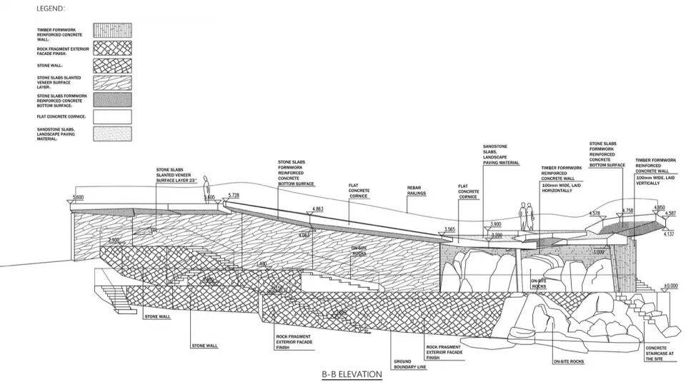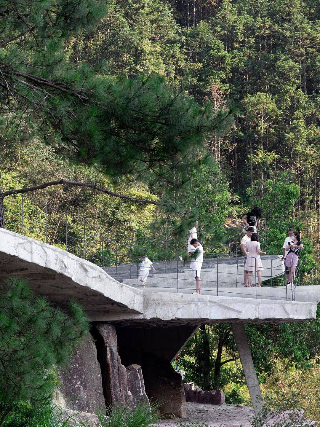 循环利用:拆除的石片模板被铺装于观景台下方台地,形成“洞穴式”地面,进一步消解人工与自然的边界。