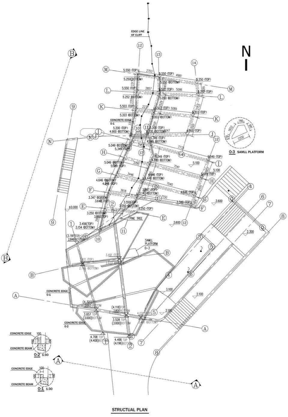 结构平面图:展示混凝土框架与斜柱的支撑逻辑。