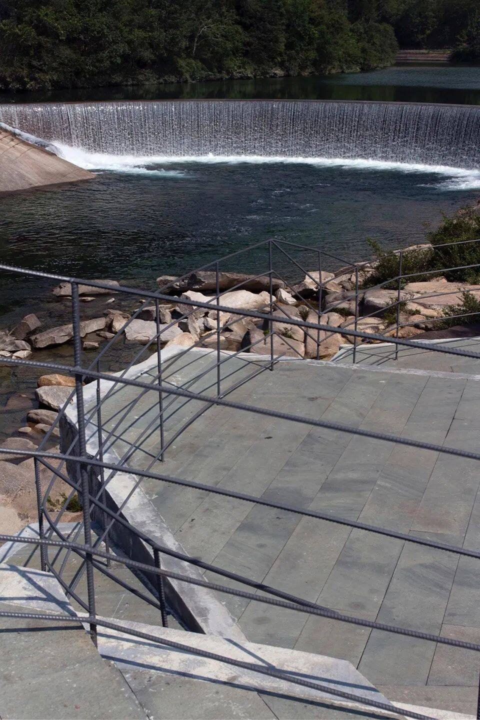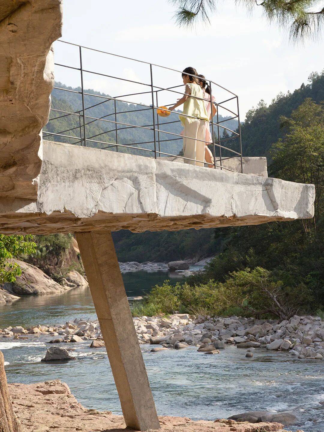 混凝土“巨石”与河床石头形成材质呼应,强化场所的地理特征。