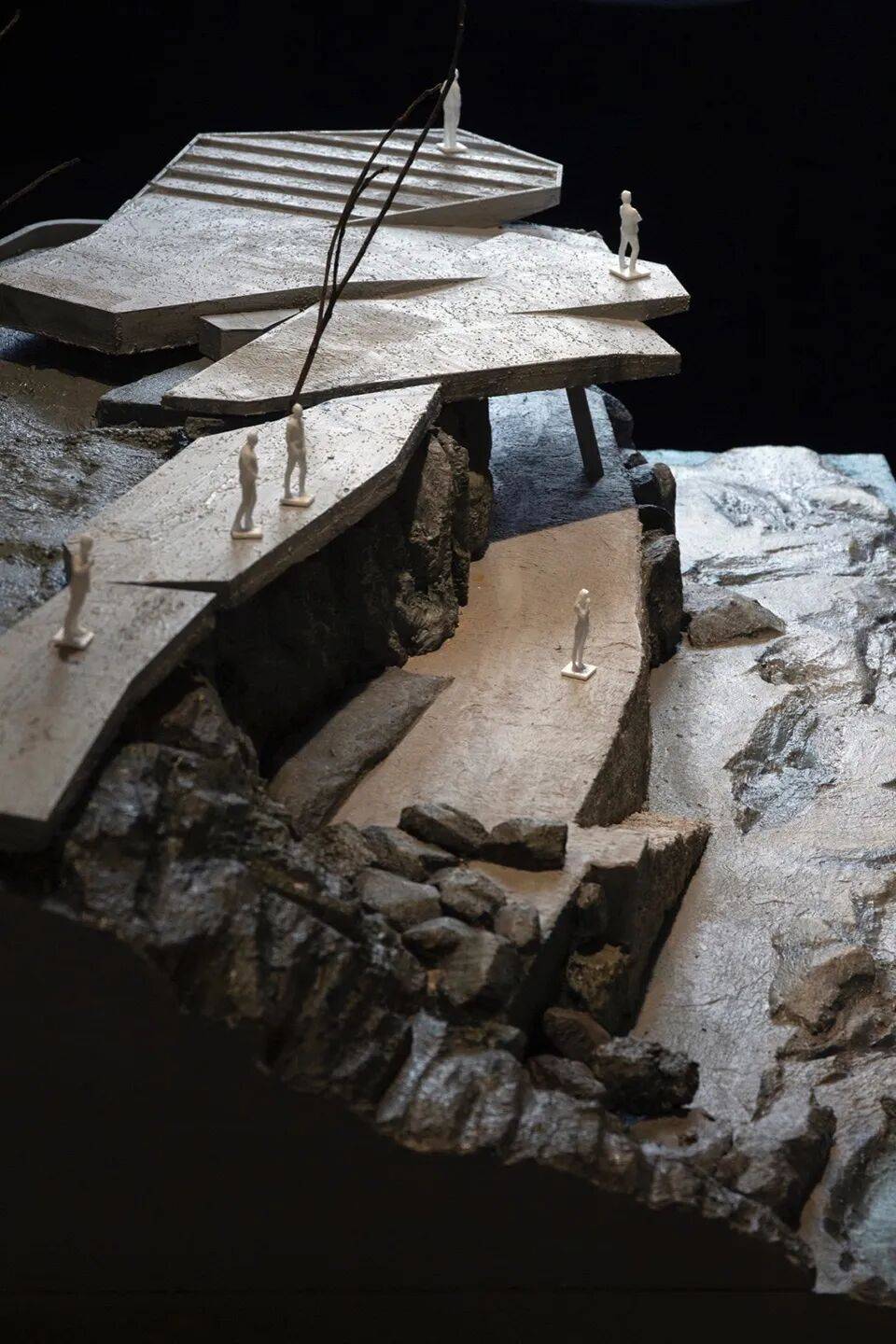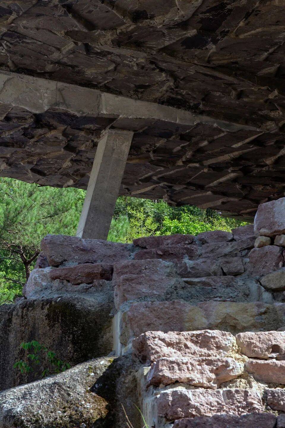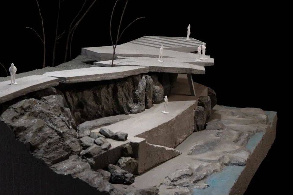 建造完成的观景平台为体验者留下一个谜题,在下层平台显眼的位置,可以看到仅有一根纤细的混凝土柱子斜向支撑着四块相互插入的人工“巨石”。力量被汇聚在这根柱子传递至地面,但同时也引起某种感知层面的紧张:如此巨石何以被单柱支撑?这种感知同样也在提示自然力量的强大与野性。