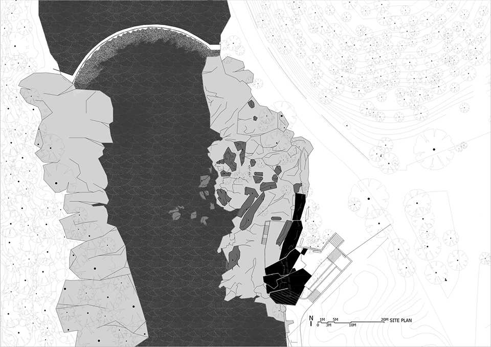 整个建筑由混凝土浇筑建造,但不同的是我们想用自然的石材来塑形混凝土。这一想法最初在模型中得到验证。搭建模型的过程也是对建造过程的设计,我们用切割成石片状的硬纸板相互叠放在木质脚手架上作为浇筑混凝土的模板。纸片相互叠放的纹理最终拓印在混凝土模型的表面。在真实建造中,纹理更加丰富的石片被叠放在木模板上,这些石片的纹理、相互搭接的褶皱最终在观景平台的底面呈现出来。当这些石片被拆除后,观景平台的底面就像是被自然雕琢的原石。而这些被拆除的自然石模板又被铺装到观景平台下方的台地上,塑造了一个如洞穴般的空间。在此,人工与自然的边界被破除,建筑不再是建筑,而是自然的镜像。