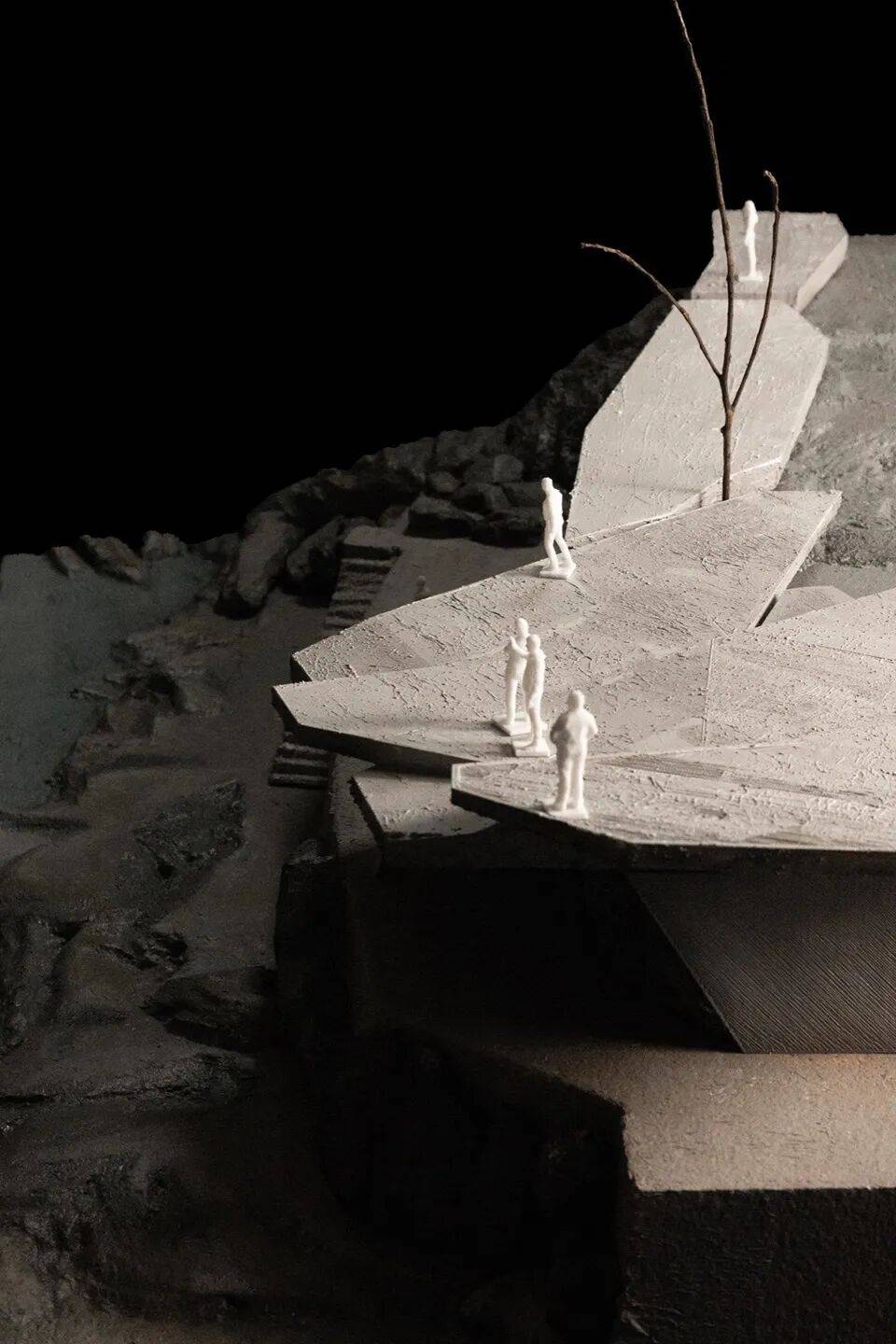 模型照片:验证“巨石”体量的几何褶皱与树木共生关系。