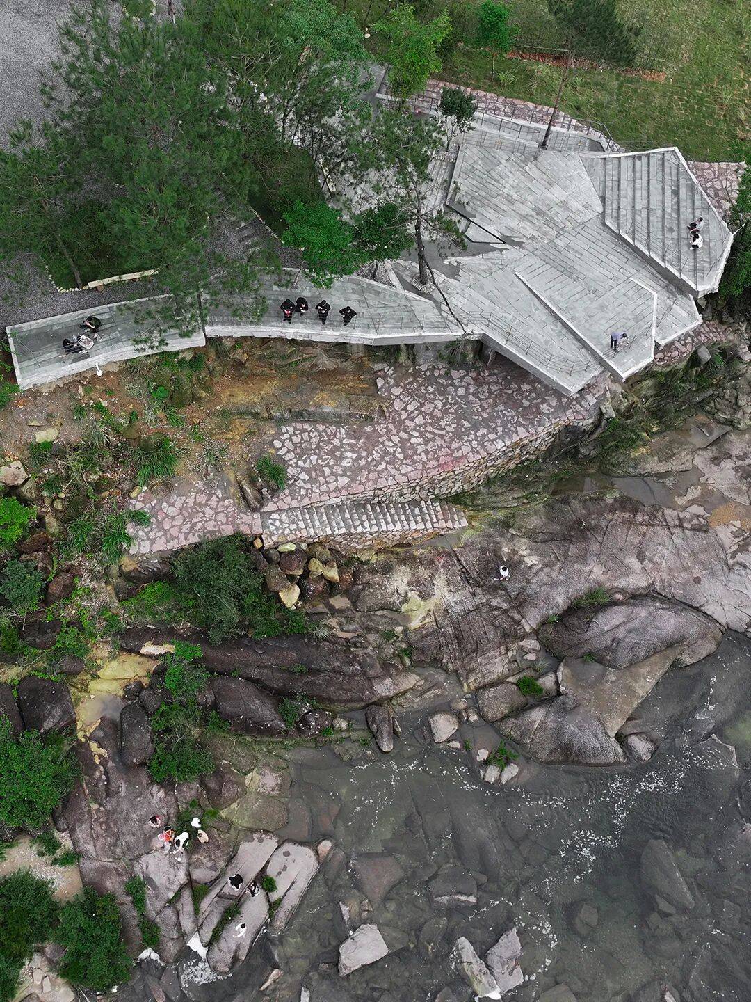 选址约束:观景台位于瀑布前唯一平坦台地,原生岩石分割上下两阶,台地上有16棵受保护树木。