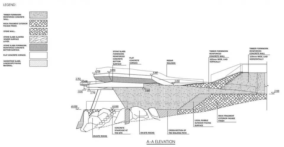 但在事实上的技术层面,这是一处被精心设计的结构表演。观景台的结构由稳定的混凝土框架体系完成,它的一侧被安放在由原生石作为基础的墙体上,另一侧则由两个斜向的柱子完成框架另一侧的支撑点。但其中一个柱子被隐藏在了墙体里,并且从石墙根部向外倾斜用以支撑顶部的框架梁。这一结构体系旨在降低造价,避免了从二层平台往外的过度悬挑所带来的技术和造价问题。