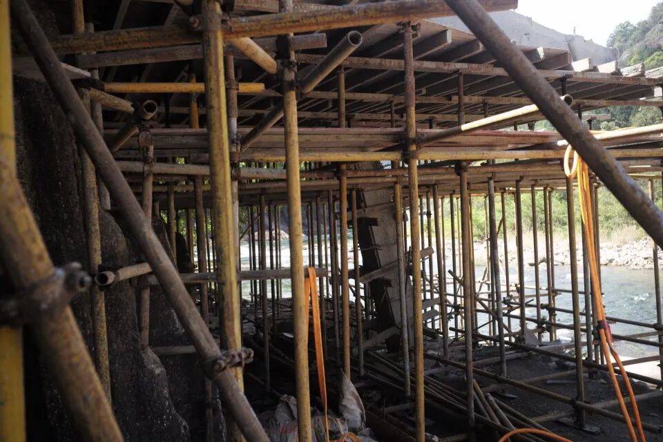 观景台由稳定混凝土框架支撑,一侧依托原生石墙,另一侧通过两根斜柱完成框架支撑(其中一根隐藏于墙内)。