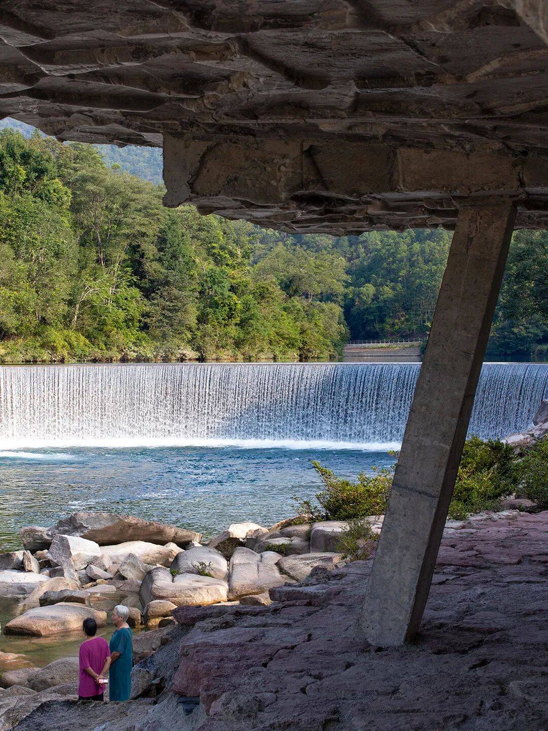 月亮湾瀑布是一处建造于1979年的人工大坝,用于调节保护区内的水文资源。它形如弯月,月亮湾因此而得名。经历近半个世纪人工和自然的相互影响,月亮湾瀑布已经完全溶于自然。瀑布的上游是一处安静的小湖面,而下游,经历了瀑布的冲洗,两岸露出了巨大的天然河石,和人工大坝一起共同构成了一处现象学意义上的场所:虽然它匍匐在大地上,但它却是这个场域连接天与山的中心。在建筑师进入这个场所的时候,一个显而易见的感受油然而生:在纯粹自然之中创造的人工空间,似乎不是生硬的“闯入”,而是隐匿在自然背后,但为自然轻轻的画上一条下划线,让自然凸显。月亮湾瀑布便是这条在阅读自然的时候勾勒的“下划线”。