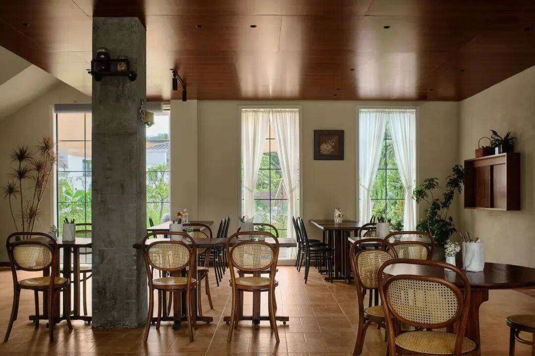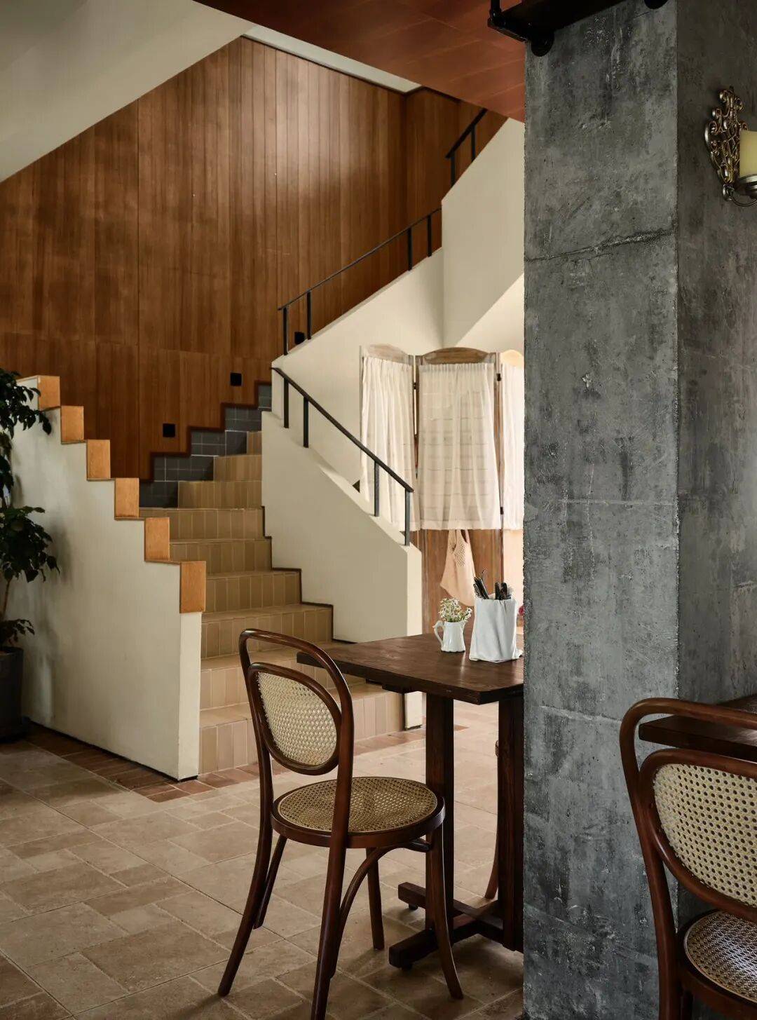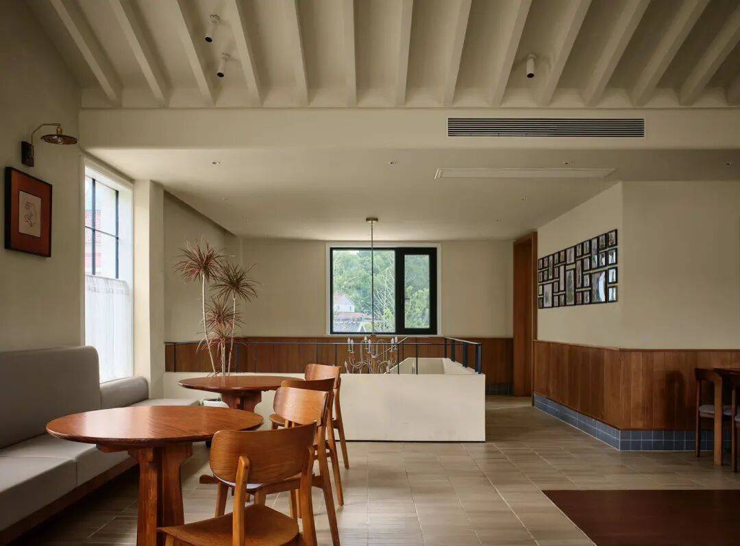 建筑维度:修旧如旧,焕新有度。保留坡屋顶骨架,拆除西侧围墙拓宽动线,用大面积落地玻璃替代狭小窗洞,实现室内外景观无缝衔接。