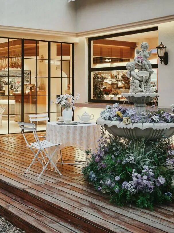 在中间我们又设置一处欧式花园喷泉装置,喷泉基座被大量花卉与绿植环绕,形成视觉焦点,同时作为庭院的核心景观节点,强化空间的仪式感与记忆点。