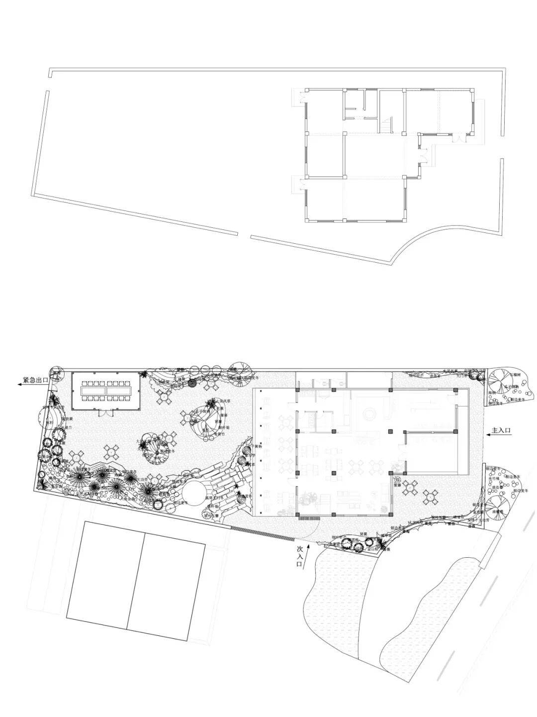 前院入口以木质平台作为主要活动地面整体抬高,周围用弧形石头围墙替代原本红砖,形成柔和的边界,从而过滤近处杂乱视野。