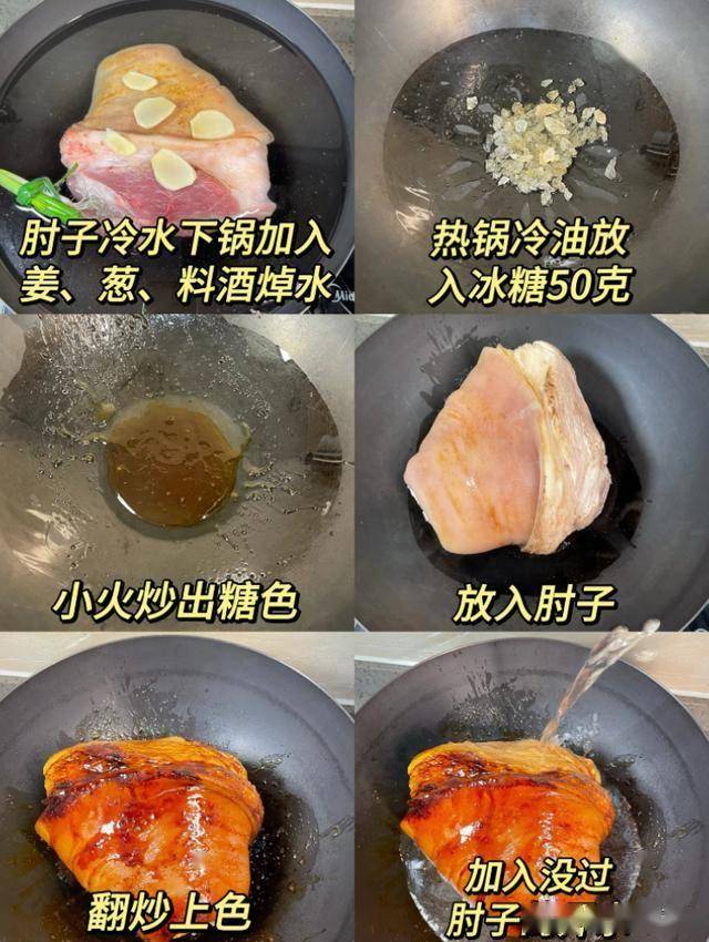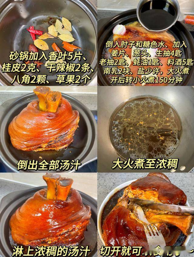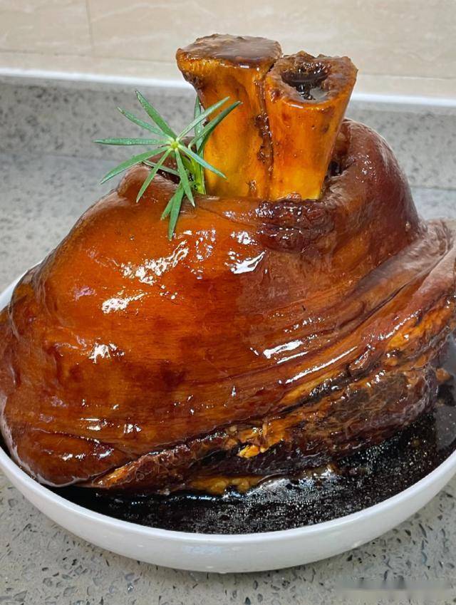 选带皮蹄髈,焯水后用冰糖炒糖色,加老抽、生抽、八角、桂皮慢炖至软烂,收汁时撒葱花更提香。