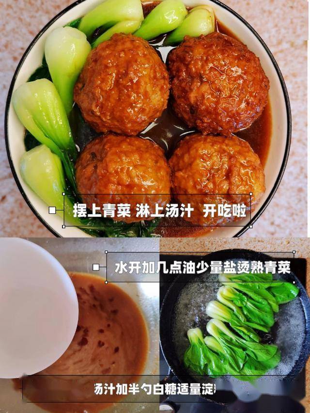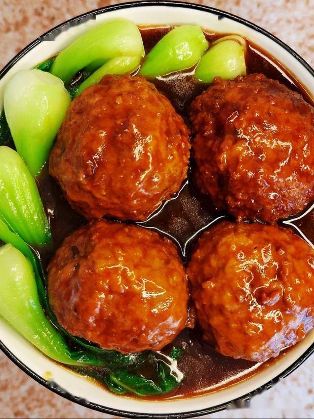 猪肉糜加马蹄碎、鸡蛋、淀粉搅打上劲,团成大丸子炸至金黄,再蒸或炖至入味,淋上浓稠酱汁更诱人。