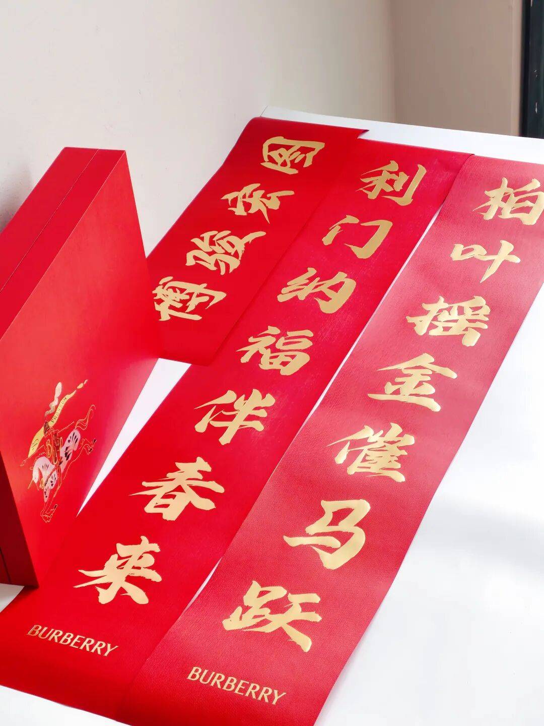 对联“柏叶摇金催马跃,利门纳福伴春来”+横批“博骏宏图”,每句开头的第一个字连起来正好是“博柏利”——既巧妙呼应了Burberry的中文名,又讨了个新春吉祥、事业腾达的好彩头。