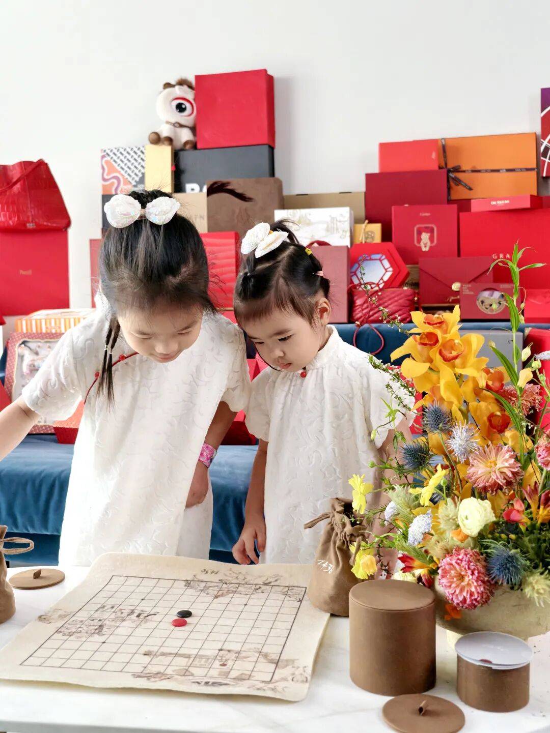 打开后是质地考究的毛毡棋盘,搭配黑红配色的棋子,不仅质感独特,视觉冲击力也很强。好奇的姐妹俩认真研究了起来,咩咩还教兔兔玩五子棋~