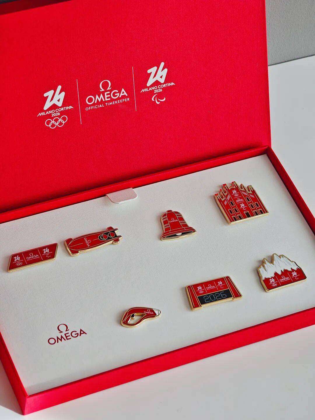 作为2026年米兰冬奥会与冬残奥会正式计时,欧米茄还送来一套冬奥徽章礼盒。打开后,雪山、雪车、米兰大教堂等多枚精美徽章,超级有纪念意义。