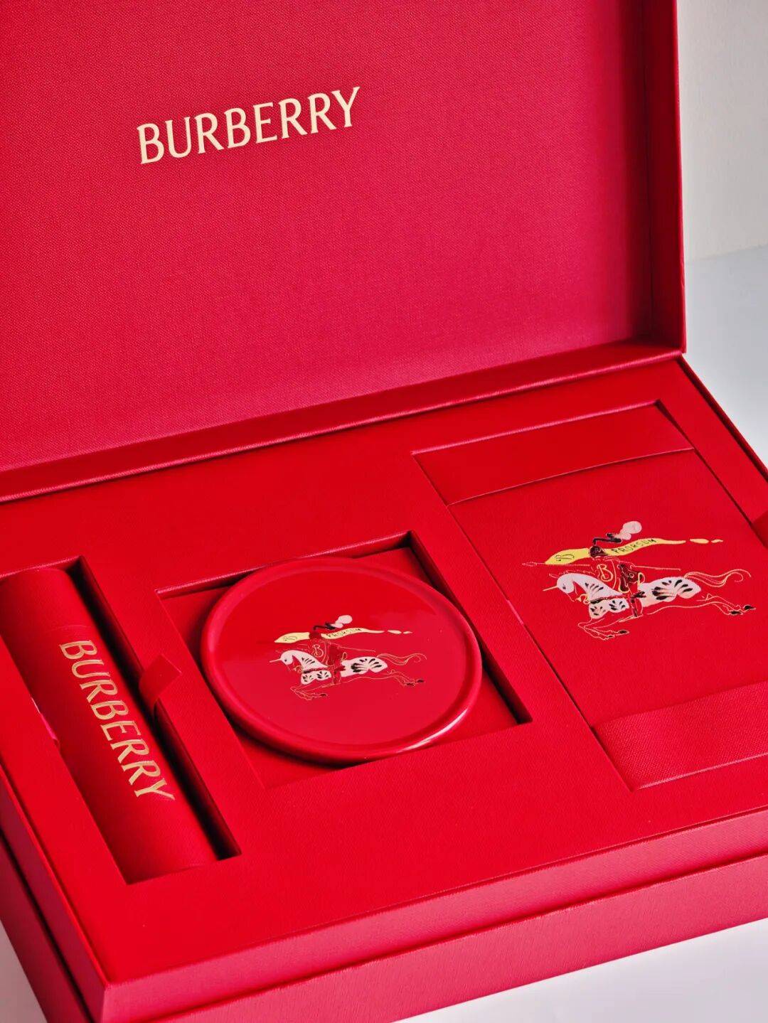 Burberry的马年对联、红包和杯垫礼盒,超级花心思。将品牌经典的马术骑士徽标,用中国传统水墨风格重新演绎,还融入了祥瑞纹样,既有年味儿又不失高级感。