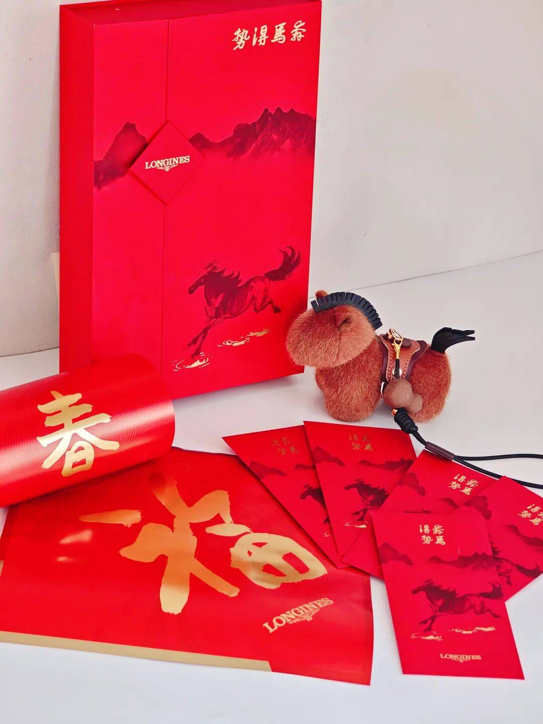浪琴的马年礼盒很中式大气。里面有春联、红包,以及一个毛茸茸的小马香挂,十分可爱~