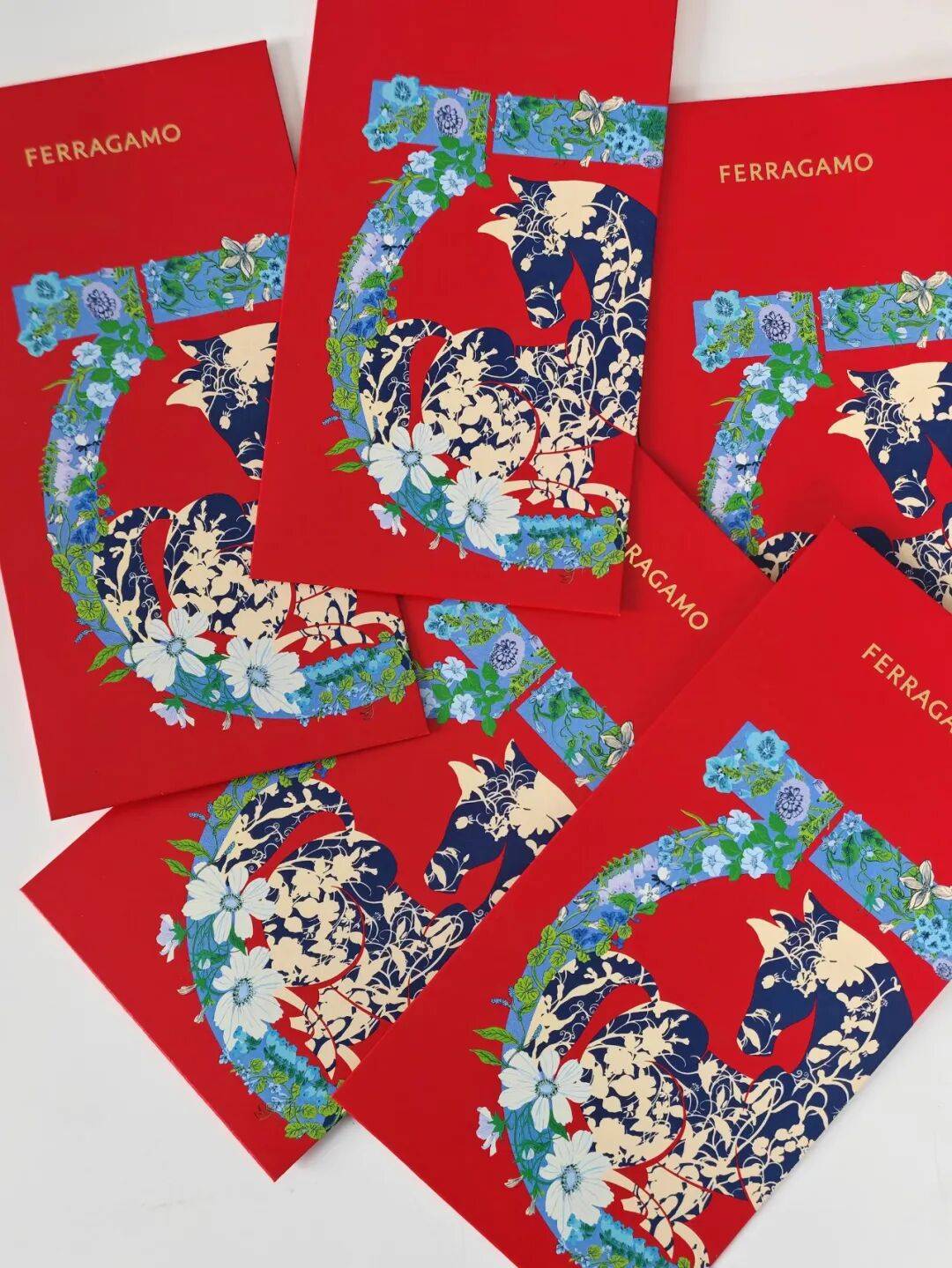 菲拉格慕的马年红包像一组微型插画。红色背景下,马儿的身上盛放着斑斓的花卉。蓝白色系花朵,让原本英气的生肖图腾多了一份意式的浪漫。