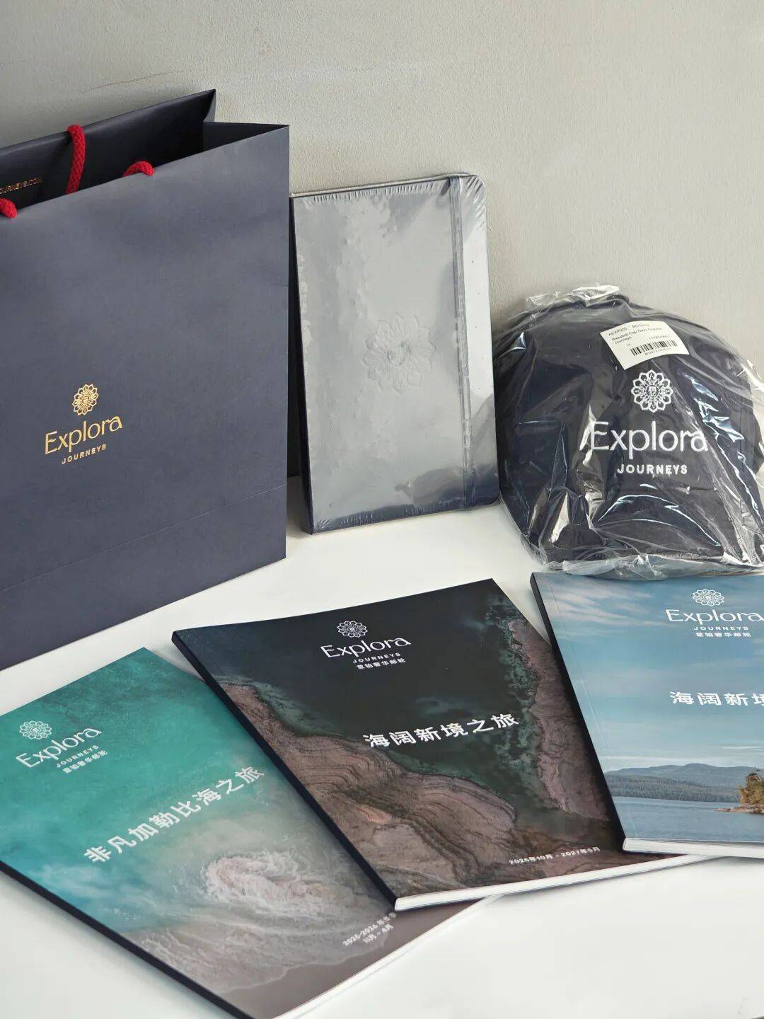 意铂奢华邮轮的礼物,有旅行必备的棒球帽,以及深色的压纹笔记本,还有几本沉甸甸的航行手册,每一页美景都写满了对旅行的向往。