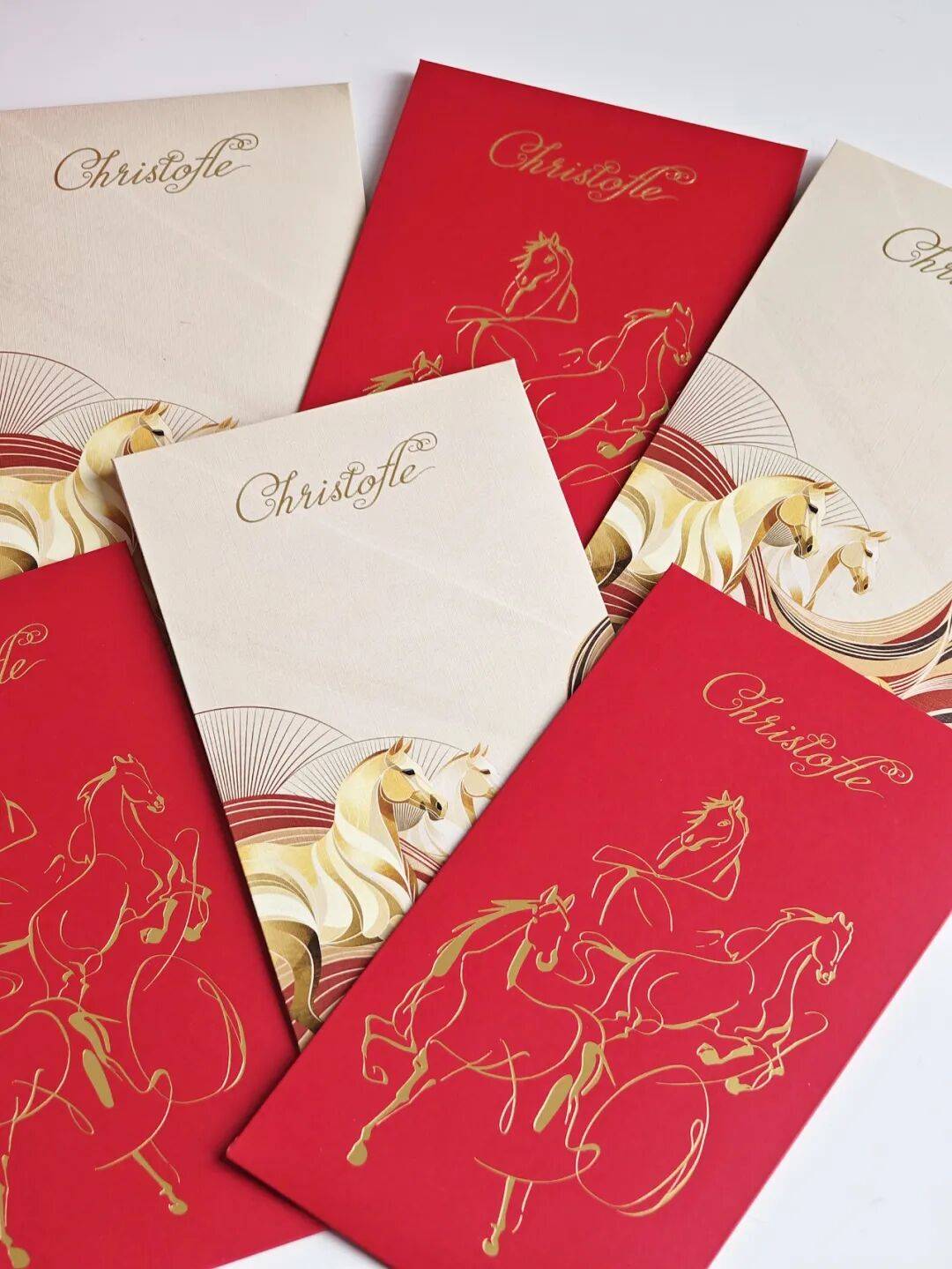 昆庭的红包有金红两色可选,金线勾勒出的马首线条流畅,极简又时髦。此外,还附有一组精美的挂坠,“福马”、“马到”的吊牌寓意满分,配上金色奔马和红色如意结,处处透着法式顶级银器世家的贵气。