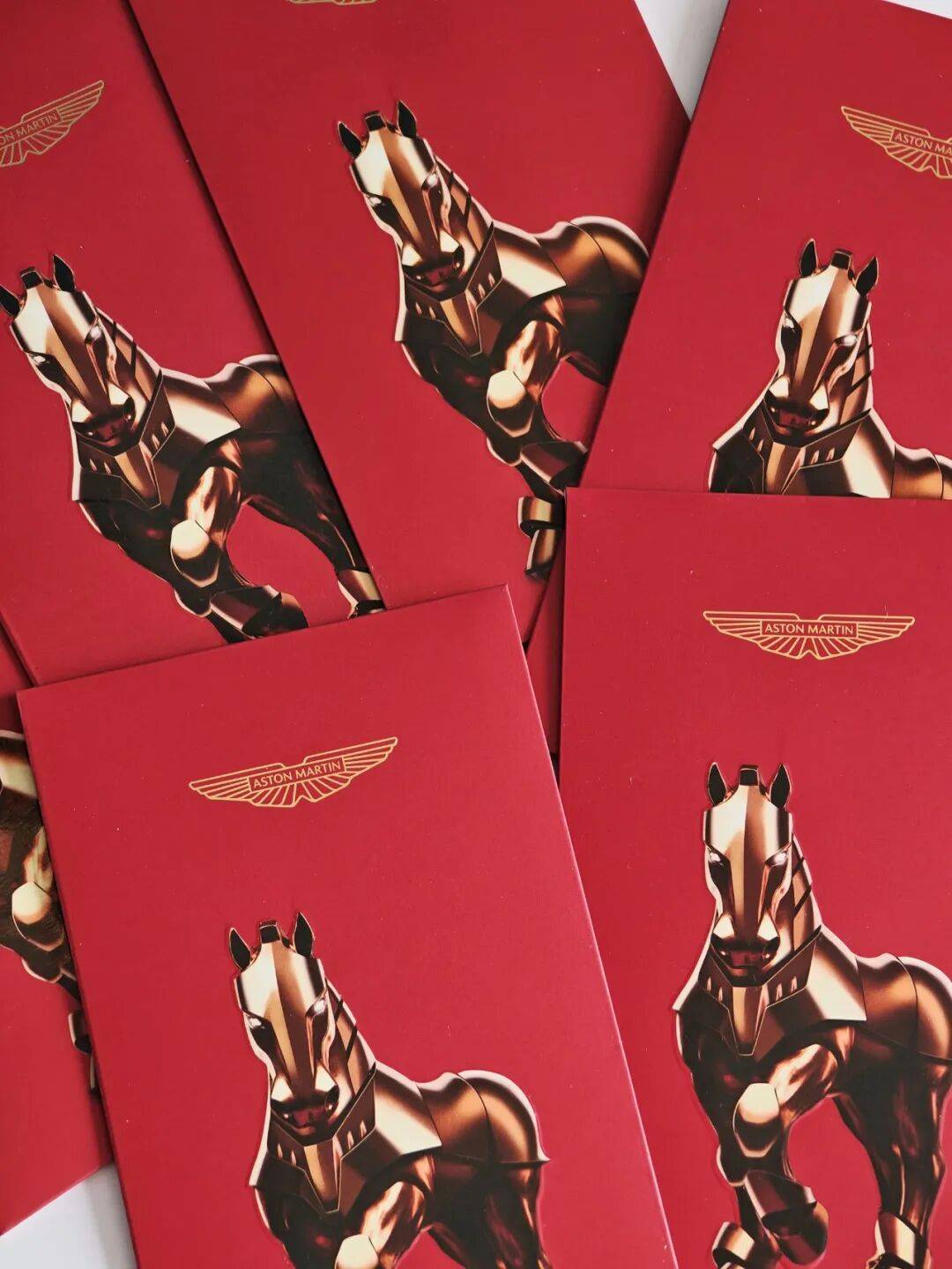 阿斯顿马丁的礼盒采用了品牌标志性的赛车绿,质感奢华。双开门的设计像是一台豪车的车门正缓缓开启,里面的惊喜非常多。红包上的金属质感战马线条流畅,充满了机械美学;而一只戴着绿色针织帽、背着小马鞍的马则萌态可掬,形成了有趣的反差萌。