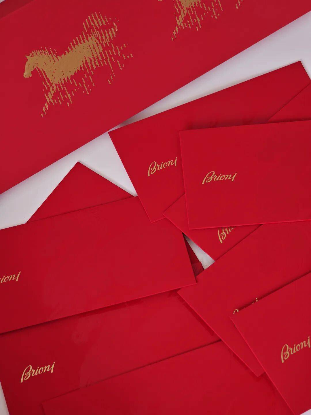 Brioni的红包视觉效果非常高级,金色的骏马仿佛在飞驰中变得身影模糊,设计感十足。红包礼盒内还附有一副烫金对联,字里行间充满了对新年的美好祝福,仪式感满满。