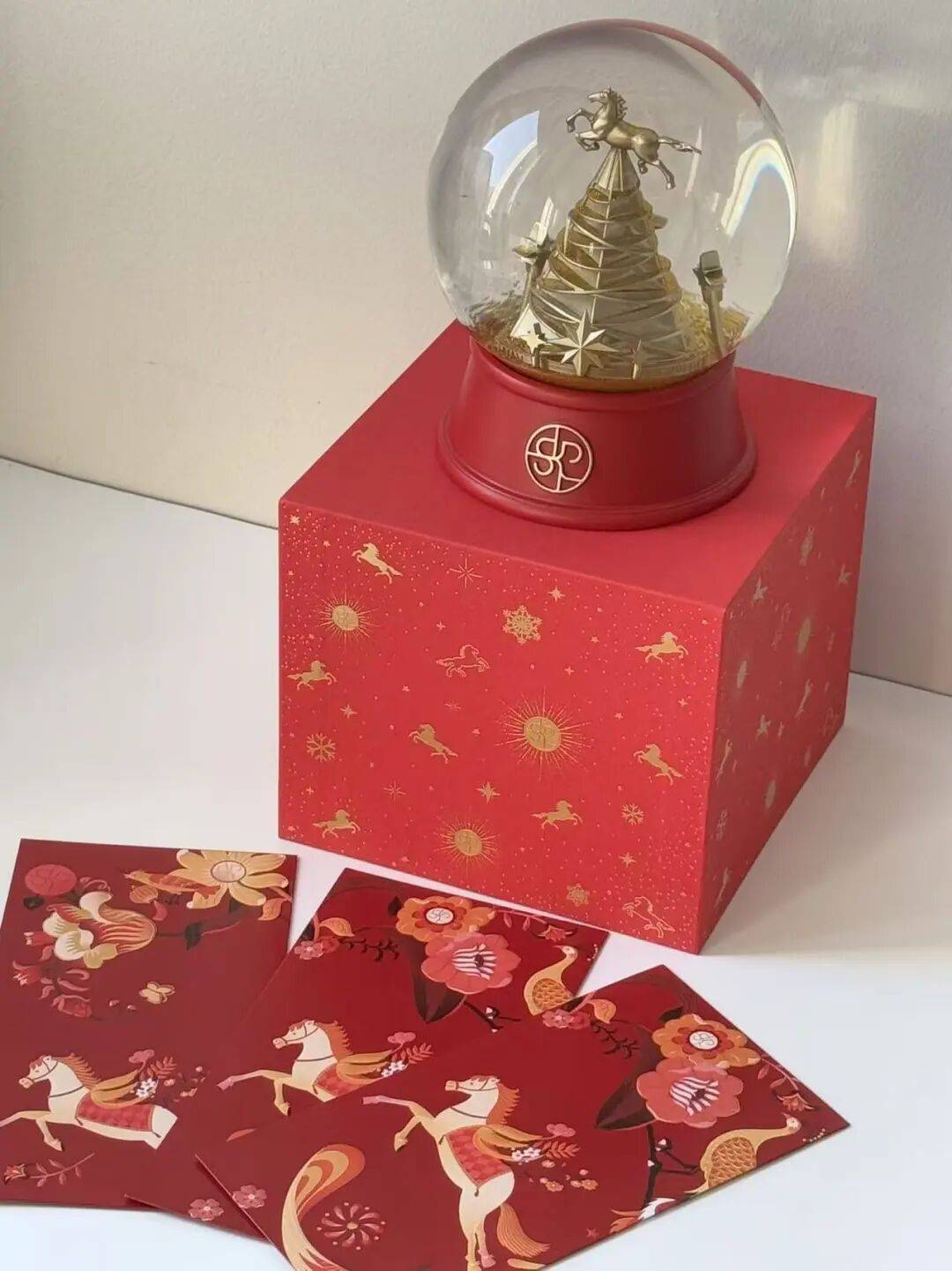 SKP的红色底座水晶球超级漂亮,里面一匹金色的骏马正在奔腾起跳。和红包上浪漫的奔马,以及花卉装饰相映成趣~