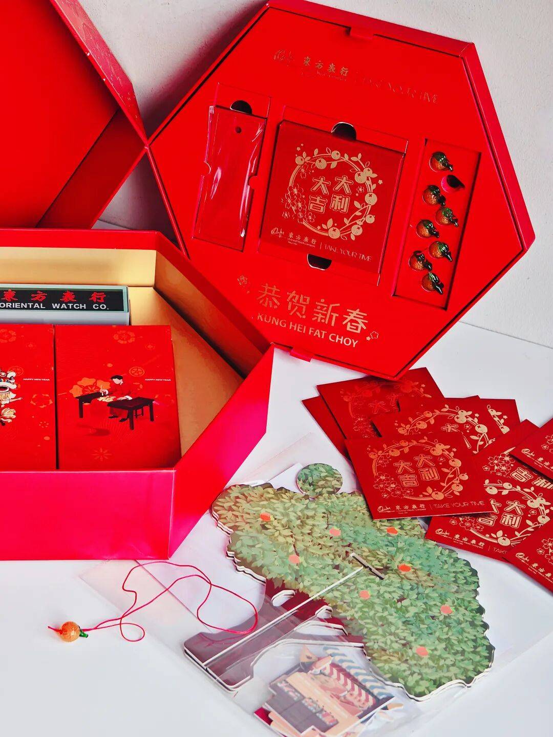 东方表行送来浓郁的“香港味道”。里面装着“祈愿榕畔”的DIY纸雕,以香港大埔林村的许愿树为灵感,亲手拼成一棵繁茂的榕树。挂上带有“大吉”的小橙子挂件,祈福的仪式感瞬间拉满。