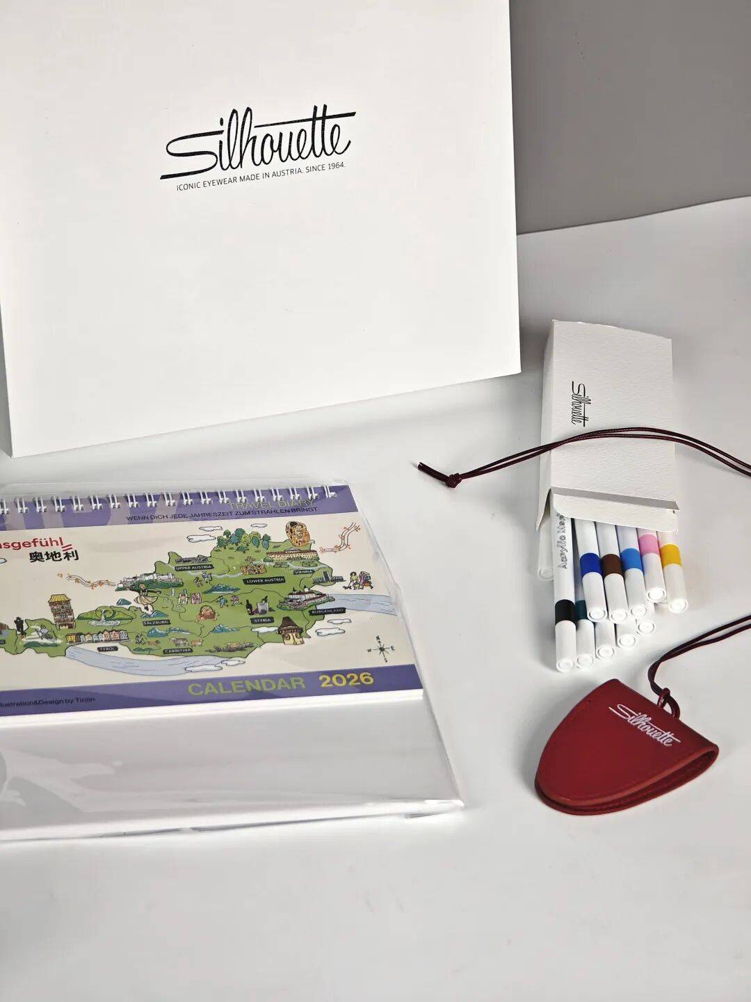 Silhouette诗乐眼镜的礼物是一本漂亮的2026年历,旅行日记的展现形式很有趣。还附上了彩色画笔与皮革眼镜夹。新的一年,开启一场说走就走的旅程吧~