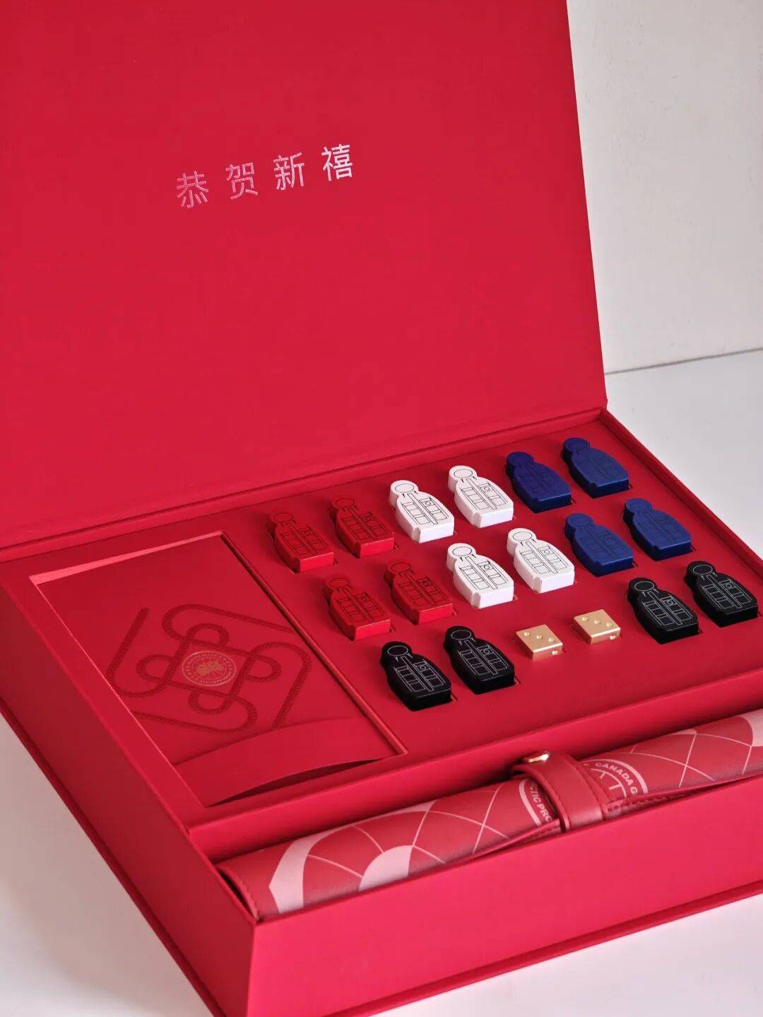 莲花跑车的新年礼盒将“赛车灵魂”与“节日氛围”玩出了新高度。红包上的几何暗纹仿佛预示着新的一年在人生的赛道上马力全开。礼盒内还包含红金配色的筹码、金色骰子以及定制扑克牌等,非常适合赛车爱好者。