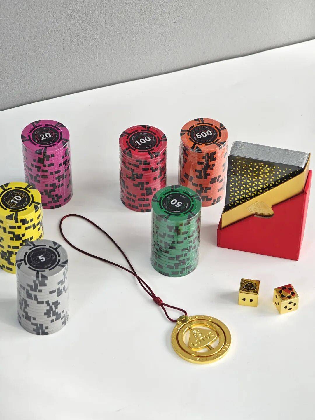 礼盒里还有红金配色的筹码和金色骰子,以及定制扑克牌。一个金色的“专属庄家牌”,还可以挂在车里。