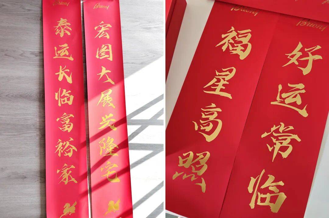 红包礼盒里面还有一副烫金对联,“宏图大展兴隆宅,泰运长临贸易家”,字里行间仪式感拉满~