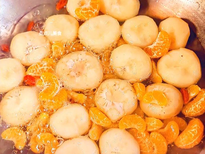 步骤5水开煮五分钟放入砂糖橘,几粒枸杞,少量多次加入水淀粉。