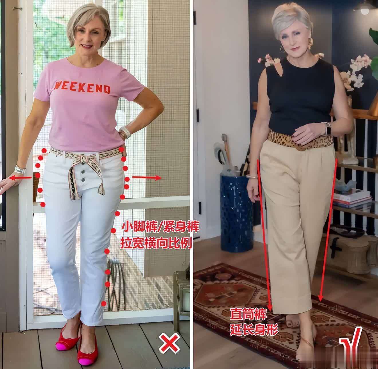 第一,「结构感」。很多中年女性身材发福后,第一反应是遮缺点,于是选择宽大服装,却让整体看起来毫无精神,还很老气。Beth则强调服装的结构感,用剪裁和线条引导视觉,而非隐藏自己。无袖或正肩上衣是她的常用单品,露出的肩膀弱化上半身的圆润感,长袖衬衫或廓形T恤则让肩部有支撑,看起来不拖沓。高腰直筒裤对腿粗、胯宽女性尤为友好,能弱化腰臀宽度、拉长身形,但阔腿裤过宽反而显胖,不宜盲目追求。
