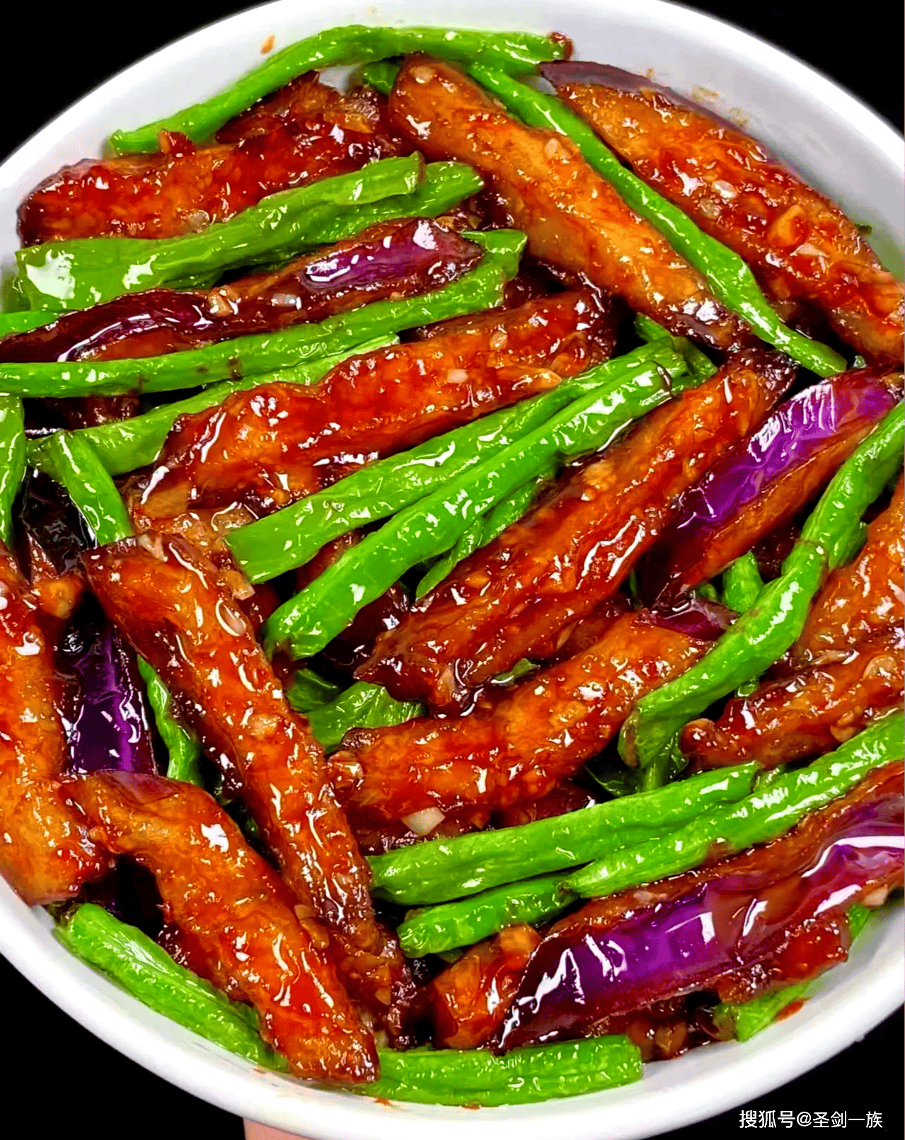 豆角需焯水至断生,与茄子同炒时淋入调好的酱汁(生抽+蚝油+糖+淀粉+水),大火收汁。