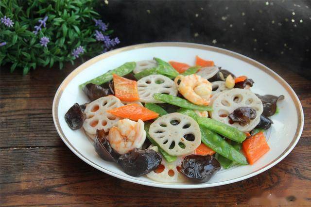 9.把五种食材一起下入锅内,大火翻炒1分钟,加入盐,鸡精,大火翻炒均匀,淋入适量的水淀粉勾薄芡,大火翻炒几下,芡汁受热变黏稠,包裹在食材上,关火,盛出装盘即可。一道色香味俱全的五彩小炒就做好了。