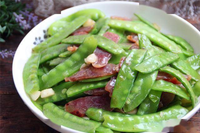 3、起锅烧油,油热后放入蒜末,小火爆炒出香味,然后倒入火腿片,翻炒至火腿片边缘微微卷起。