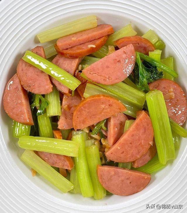 2.热油爆香葱蒜末,下入火腿肠炒香,再加入娃娃菜炒软