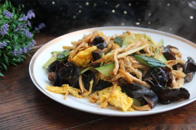 7.再下入黄瓜片和鸡蛋块翻炒均匀,加入盐,淋入料酒和酱油,翻炒均匀,淋入1汤匙香油,关火,盛出装盘,一道色香味俱全,营养丰富的木须肉就做好了。